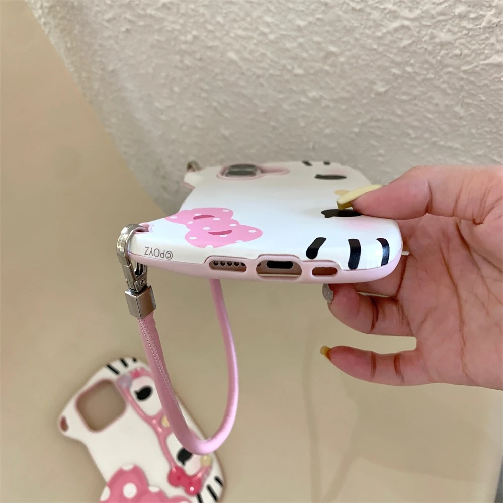 3D Hello Kitty Glasses Cute Pink Bow Lovely Phone Case For iPhone Hand Strap Cord Back Cover